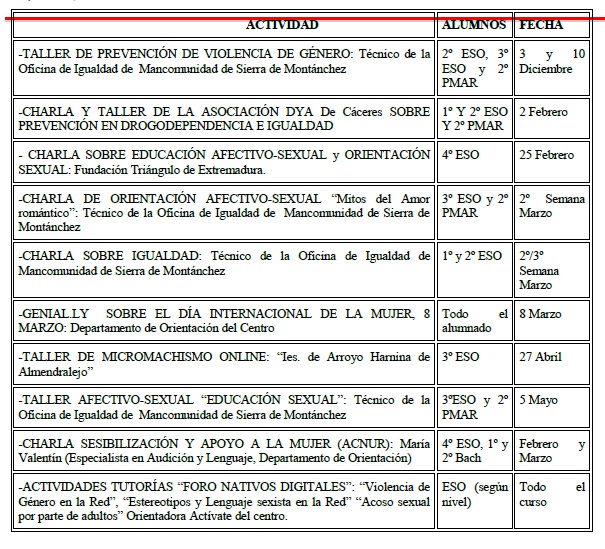 A continuación se exponen la relación de actividades extraescolares que realizadas por el Departamento de Orientación realizadas en este a lo largo del curso desde el PAT, en pro de una Educación para la Igualdad y no sexista: